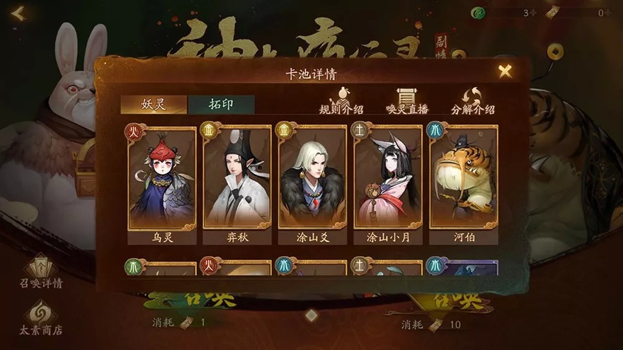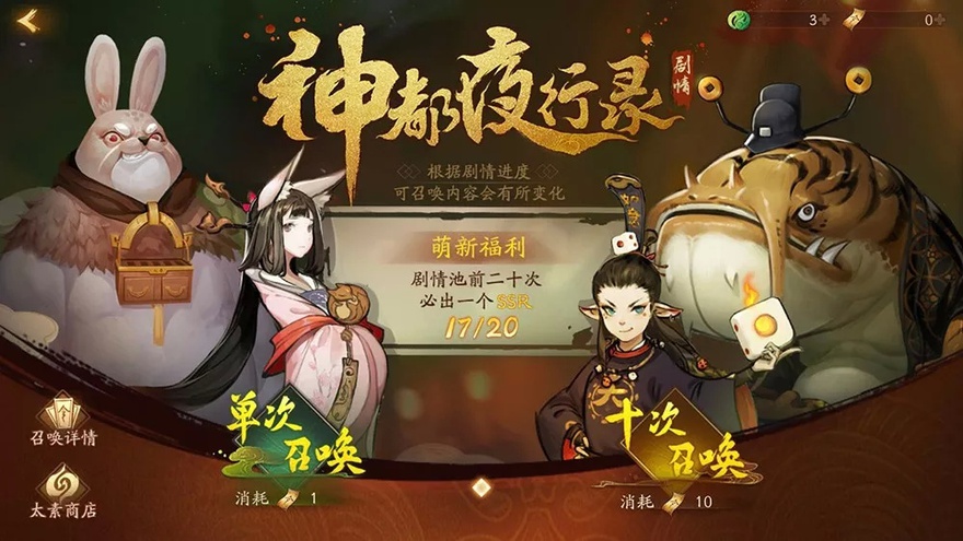 神都的卡池里有 妖灵 和 拓印 两部分,妖灵的概率要低一些,SSR妖灵就更低了,总抽到拓印还是有点伤的。 唤灵符可以屯一屯, 随着剧情推进,会有更多的妖灵进入卡池 。留着抽一个十连,比一开始单抽要划算。 不过幸好有萌新保底机制,剧情池 前20次必定会出一个SSR 。我已经抽到第17个了,还是无事发生过。