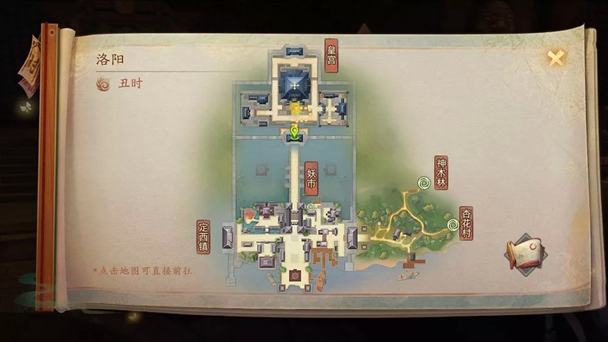 洛阳皇宫,妖市,杏花村,只要你点一下小地图,坐骑就可以带你过去。对于休闲的风景党也很友好了。
