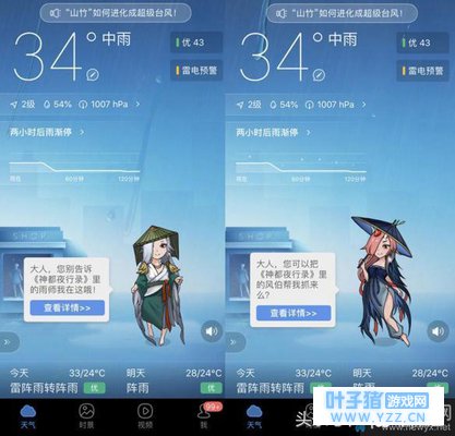 风伯雨师入驻墨迹天气 更有特别推出联合活动:将墨迹天气App首页的风伯或雨师形象截图发至微信公众号【墨迹天气MOJI】后台,活动结束后随机抽取40名用户送出风伯+雨师立牌周边一套。超级超级限量款!中奖名单将于10月10日在上述微信公布。 此外,游戏内还有推出墨迹天气限时传奇称谓、定制相机贴纸,和“金风玉雨鱼龙夜”活动小彩蛋等着诸位降妖师去发现,快去下载游戏吧! 国韵巅峰 集妖灵维秩序 不仅有古风国韵的风伯和雨师,《神都夜行录》中描绘的妖灵世界大多基于中国传统神话故事以及鼎盛时期的唐朝。游戏每一处细节都充满了国韵美学。玩家们将要扮演成为降妖师,行走人间妖界,遇见不同妖灵,或并肩作战,或降妖除魔。游戏中充满与妖灵的温暖羁绊,玩家可以在“家园系统”中,打造专属于自己的家装风格,并且通过和妖灵一起玩捉迷藏、闻歌起舞、焚香沐浴等活动,去培养提升感情,增强战斗中的实际能力。