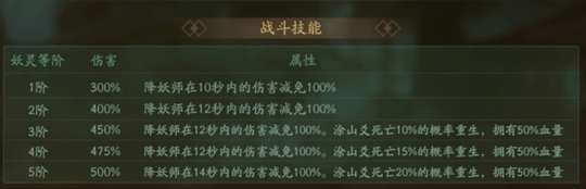 涂山爻技能描述: 一阶技能:造成300%技能倍率,降妖师在10秒内的伤害减免100% 二阶技能:造成400%技能倍率,降妖师在12秒内的伤害减免100% 三阶技能:造成450%技能倍率,降妖师在12秒内的伤害减免100%,涂山爻死亡10%的概率重生并拥有50%血量 四阶技能:造成475%技能倍率,降妖师在12秒内的伤害减免100%,涂山爻死亡15%的概率重生并拥有50%血量 五阶技能:造成500%技能倍率,降妖师在14秒内的伤害减免100%,涂山爻死亡20%的概率重生并拥有50%血量。 评价:这里引出了两个新名词:“伤害减免100%”,“重生”。首先我们先来说伤害减免100%,也就是我们口中常说的“无敌”,有一点注意的是涂山爻的无敌时间看起来有10秒+,但是涂山爻的自身大招动画也会计算无敌时间,提前在boss狂暴前开涂山爻技能,防止涂山爻吃到boss狂暴伤害是增加续航时间的关键。其次便是“重生”,之前我们在阿织司羿的活动中便接触过这类名词的拓印,而涂山爻的的重生是不稳定的,哪怕是满阶也只有20%,还是很看脸的,所以前文提到的控制涂山爻开大时机是增加续航时间的关键。