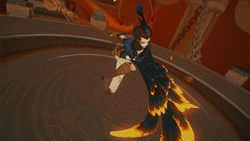 在游戏中,金乌拥有一张精致冷漠的面孔,婀娜的身姿被红褐色羽翼披风覆盖,时常挥舞着古铜色等身长戟,威风凛凛,巾帼不让须眉。而其脑后悬挂着由三个火云勾玉组成的日冕,正是太阳化身的象征。