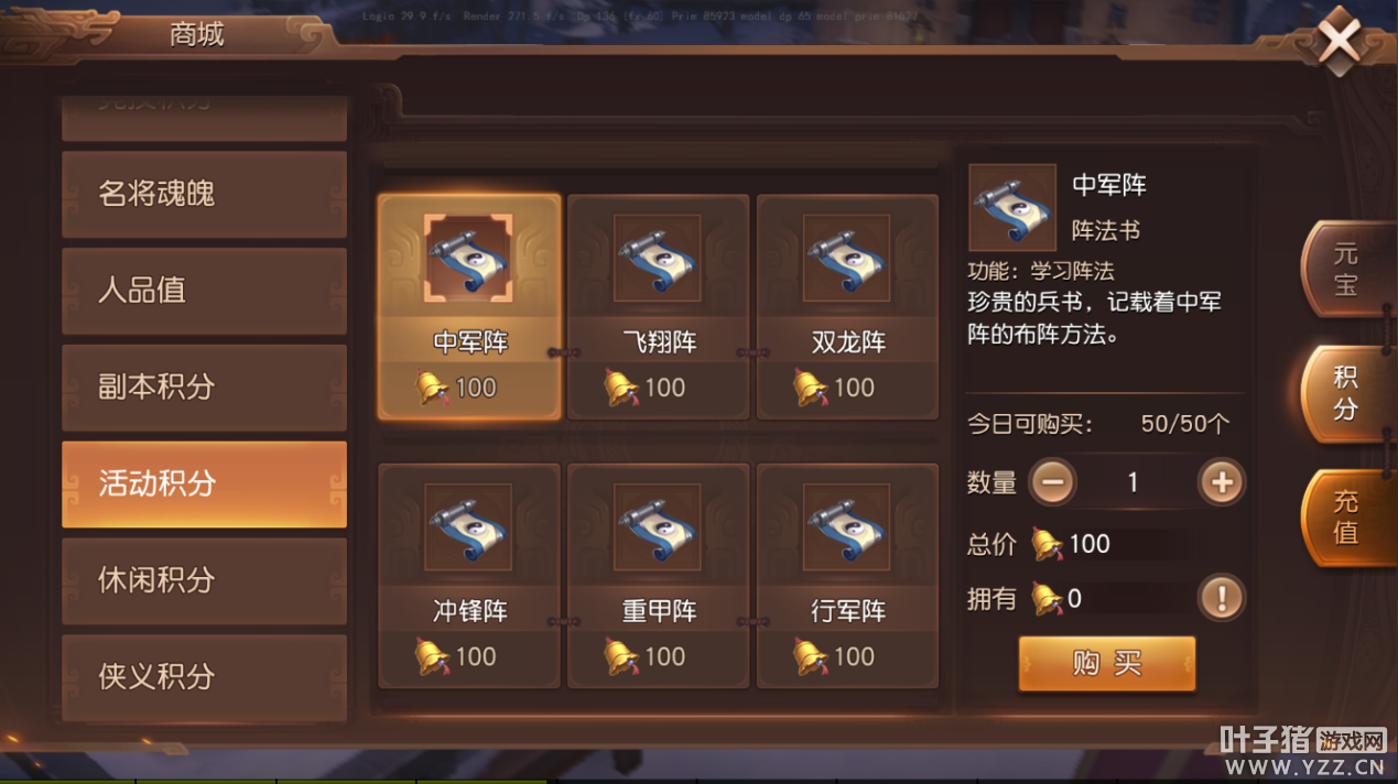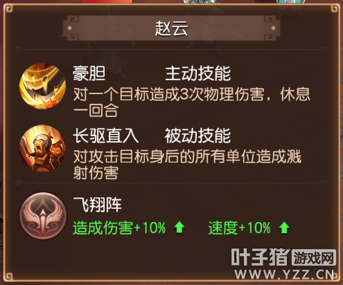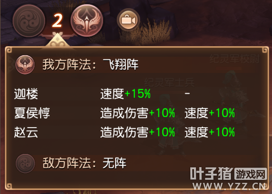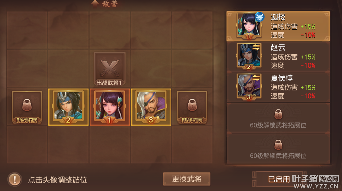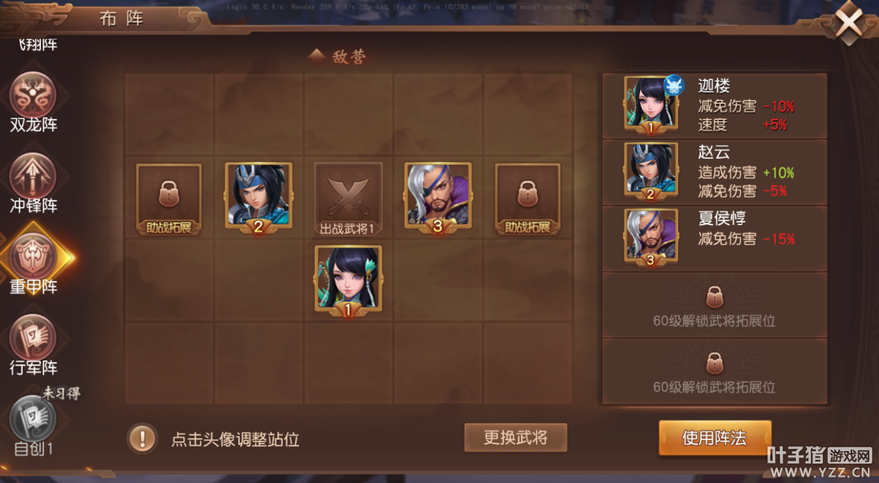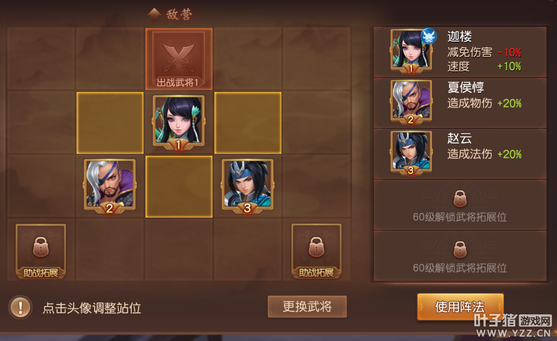 完成主线剧情和等级礼包就可以解锁阵法,其他的阵法可以通过积分商城中用活动积分换取。 使用阵法书后就能学习对应阵法啦,自创阵法目前还没有开放,可以期待一下 选择适合的阵法后,点击使用阵法即可切换当前使用的阵型。阵法上每个角色位都有不同的属性加成。出战武将没有阵法加成。 阵法决定了初始1,2,3号位置在战场中的实际地点,角色站位只能位于1,2,3号位置内,点击阵法中的头像或右侧列表中的单位,可以选择调换位置,黄色亮起的位置就是可以交换的地方 单人任务时,可以率领三名武将参战,其中一名为出战武将(战斗内由玩家亲自控制)其他两名为助战武将(由系统AI控制),60级以后可以额外增加两名助战武将上场。多人组队时,每个角色都可以率领一名出战武将。最多可以3人组队。出战武将可以在自己主公的前后左右的空白位置调换站位,可以利用初始的站位获得额外的战斗优势哦。 战斗内点左上角的阵法标志可以观察双方的阵法效果 长按单位也能查看对应单位当前的阵法加成情况 使用技能时,就能看到对方的具体阵法站位情况 了解更多相关信息,请前往http://game.yzz.cn/html/info-5595.html |