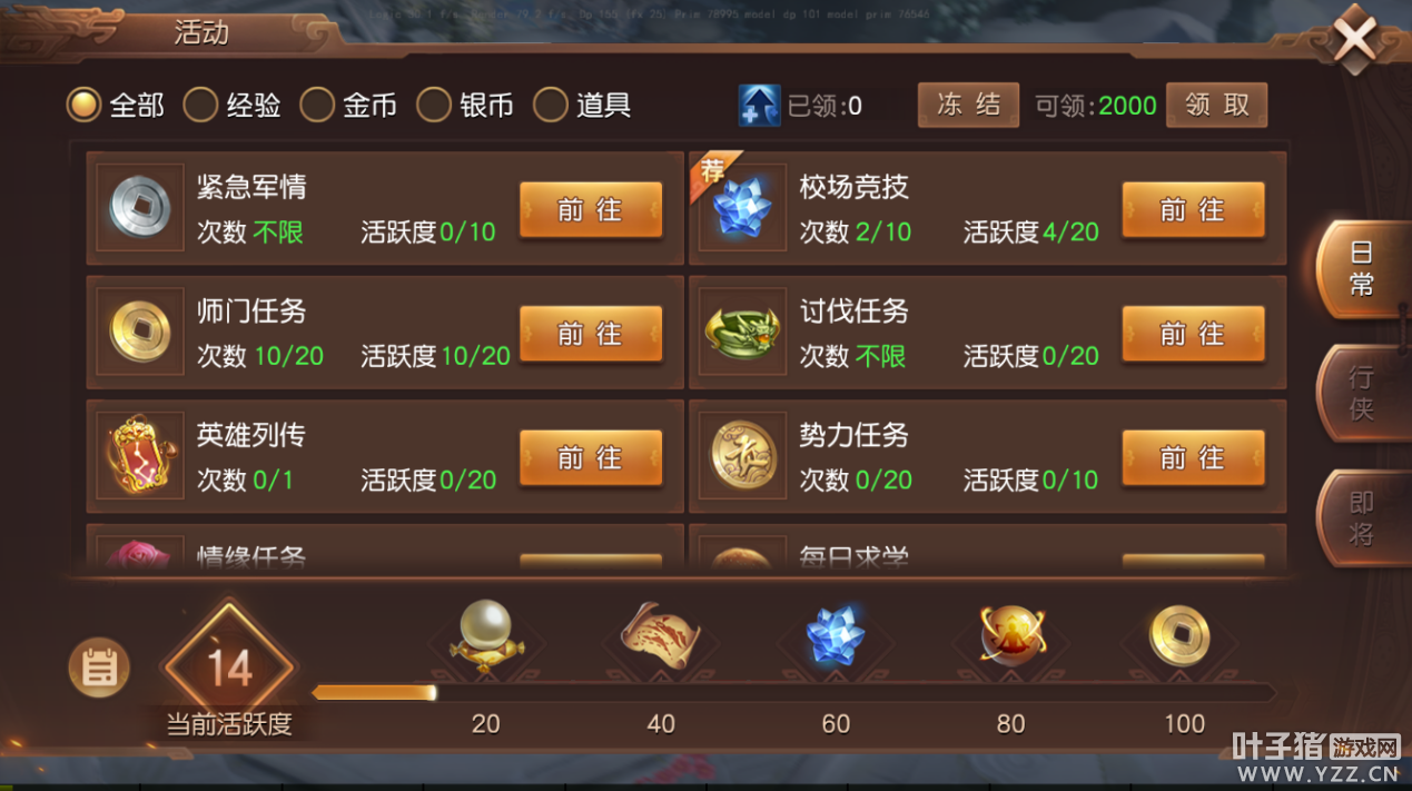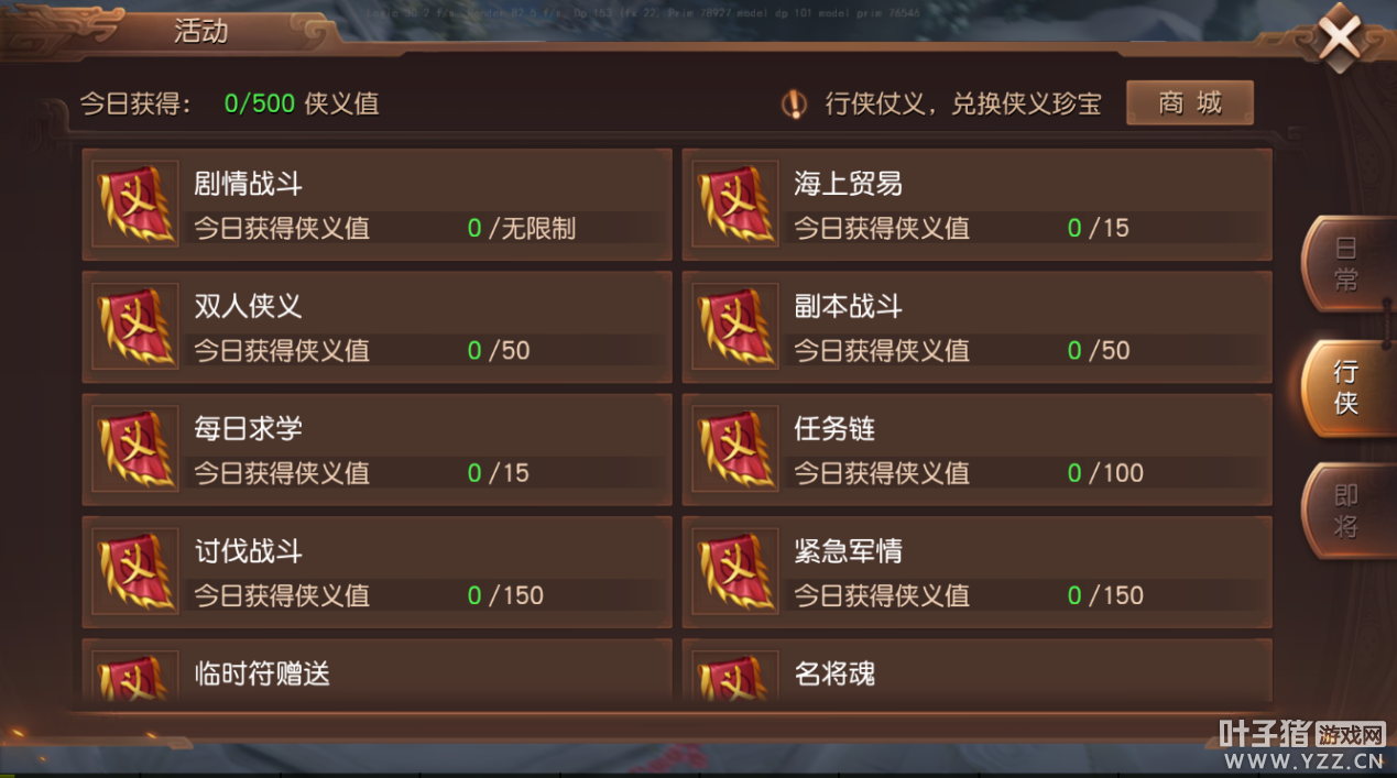 “天下有志之士,行走天下,必先磨练自身,方能建树国家。” 在三国如龙传中侠士们要磨练自身,必然要先熟悉其中的任务系统,为了侠士们能够更快的融入进这奇幻的三国世界,下面我们便来简单的了解下三国如龙传中的任务系统吧! 登陆游戏后,玩家可以在游戏界面的右边找到任务面板,如果没有看到,也不慌,仔细看便会发现一个小箭头,点击小箭头就会展开被隐藏起来的任务面板啦! 任务面板中显示着玩家已经领取的任务,各位侠士们要记得常看看任务面板,不要遗漏了什么重要的任务才好哦! 在任务栏中点击想要去做的任务,角色便会自动前往任务地点了,是不是非常的方便实用呢! 在任务栏中点击想要去做的任务,角色便会自动前往任务地点了,是不是非常的方便实用呢! 如果侠士们发现当前的任务栏中并没有自己想要做的任务,不要担心,只需要点击任务栏上的任务按钮,变可以看到更加详细的任务列表了,其中包括了详细的当前任务以及当然任务描述;可接任务以及详细的可接任务描述,从此侠士们再也不担心不知道做什么任务了,看看任务介绍,想做什么做什么! 除此之外玩家在游戏界面的左上方也可以找到活动的图标,通过点击活动图标,玩家可以看到更多类型丰富活。对于重要的限时活动,界面左上方也会不断播放开启预告,侠士们千万不要错过哦! 各位侠士们在这奇幻的三国世界中闯荡,一定要记得多结交朋友,遇到了弱小也要记得多施以援手,多多行侠哦! 在活动界面中玩家可以看到每天的行侠记录,正所谓日行一善,侠之大义者! 看完这些,侠士们是否对这奇幻的三国世界的任务系统有了一个大致的了解呢? 了解更多相关信息,请前往http://game.yzz.cn/html/info-5595.html |