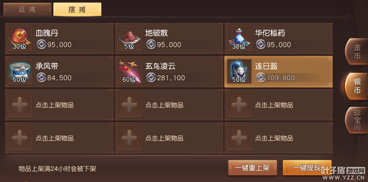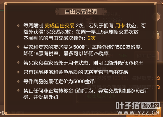 交易系统 25级时会开启交易功能,可以在金币商会和银币摆摊中使用金币或银币购买或出售需要的物品 金币商会中出售了宝石,打造装备的材料,制造书,宝物符印书,培养武将的各种珍稀道具,坐骑培养的各种道具以及五圣器。每当需要使用某个道具时,常来金币商会中看看。平时任务获得的非绑定道具,也可以出售到金币商会中换取金币。 银币摆摊中出售了各种药品,烹饪,武将宝物,临时符,打造炼金符,任务装备,花卉,古董,日常任务需要的各种道具大都在银币摆摊中可以找到,势力技能生产出的物品也可以放在银币摆摊中售卖,银币摆摊中的物品都是玩家之间互相流通的,上架的物品被其他玩家买到后,一键提现就能获得大量银币啦。 50级时会开启珍宝阁功能,珍宝阁中可以购买到其他玩家出售的珍品装备,金色宝物或者其他奇珍异宝,顺便说一句,只有50级及以上的装备才有可能会打造出珍品。 珍宝阁中需要使用金币进行买卖,买到的物品30天内无法再售出。如果你想出售自己的宝贝,可以进行上架,自由定价但最低不少于5000金币,上架后的物品进入公示期,公示审核需要24小时,通过公示审核的物品进入出手期可以被其他人购买。出售期持续7天,若7天都无人问津,物品就会被下架哦。但没关系,出售期的物品,每天可以降价一次,每次降价不超过当前价格的10%,降价也无需重走上架流程。若你的物品被购买,买家花费的货币会被系统审核,审核期20个小时,审核通过后,会收到系统邮件,系统会扣税9%,然后在交易记录界面就能领取到金币啦。 达到60级时,还可以开启自由交易,选择要交易的玩家,点击目标头像,就能看到自由交易选项 或者在好友对话中也可以直接开启 可以交易的物品限于珍品装备和金色宝物,同样可以自由定价但最低不少于5000金币,每周可以交易2次,如果你拥有月卡的话,还可以额外获得1次交易次数。自由交易的税率是14%,但如果双方的友好度足够高或者双方都处于月卡状态时,可以额外获得减税,最多可以降低到0%。交易完成后,买家花费的货币会被系统审核,审核期20个小时,审核通过后,卖家同样在交易记录界面中可以领取到金币。 以上就是交易系统的攻略啦 如何赚钱 怎么快速获得金币和银币呢? 当然是用元宝买啦,商城里的一箱金币和一袋银币可以直接获取大量财富,每周限购还有折扣优惠。 游戏里也有很多途径可以获得金币,每天刷完任务和限时活动,可以直接获得金币和大量道具,不需要的直接出售掉就好啦。 再有就是通过珍宝阁,出售珍品装备,金色宝物和神将魂魄,也能从其他玩家那里赚到金币。 另外50级以后去洛阳城寻找莫无木,购买洛阳铲,可以挖出各种宝物,运气好的话,就发财了。 赚银币最好的方法就是修炼势力技能,打造技巧,裁缝技巧,炼金技巧,炼丹制药,烹调料理都可以产出各种物品,每日完成活动可以获得活力,在银币摆摊出售这些生产出来的物品,就能大量获得银币啦,直接用活力进行打工也能获得银币。 多多完成日常任务和限时活动,也能直接获得不少银币奖励,赚取银币很容易哒。 了解更多相关信息,请前往http://game.yzz.cn/html/info-5595.html |