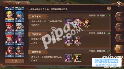 良将亦能提升战力,武将培养速成指南 在60级前,最多可上阵一名出战武将及两名助战武将;达到60级后,上阵的助战武将增加为四名,即最多可上阵五名武将。《三国如龙传》目前共有一百多名武将供玩家进行收集、培养,那么除了五名出战武将之外,其余的武将是否就没有作用了呢? 《三国如龙传》的武将系统中引入了“武将缘分”的概念,开发组基于大量三国史实,将各武将之间发生的历史典故设计为武将缘分。当玩家收集到对应武将后便可激活属性加成,不论相应武将是否出站,属性加成都将作用于角色身上,获得战力提升的同时还能了解对应的历史典故,并满足武将收集的乐趣,可谓是一箭多雕,良将也能为战力的提升带来帮助。