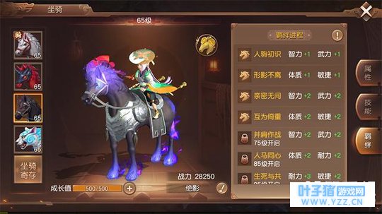 等级提升,成长第一步 在坐骑界面中对坐骑选择“骑乘”,将坐骑设置为骑乘状态,就可以在战斗、任务中获得经验。 除此之外,还可以在金币商城中购买驯兽秘术为坐骑增加经验。达到一定等级后,就会解锁与角色的羁绊,每条羁绊都会对角色属性有一定的加成。无论什么时候,等级都是非常重要的。