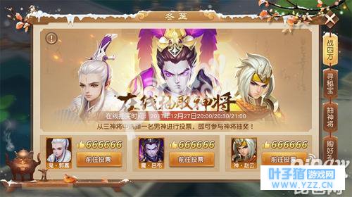 如龙男神:玩家可以每天在活动界面,在神赵云、魔吕布、鬼郭嘉三位如龙男神中,选择一位为其投票打call。在投票之后,玩家不仅能获得丰厚奖励,在活动结束后,系统还将从投票玩家中抽取三个神将。向单一神将投票越多,获奖概率也会越大哦!