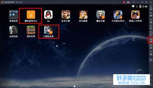 二、打开雷电安卓模拟器,在雷电游戏中心搜索“三国如龙传”进行下载,或通过模拟器右侧栏目里面的APK安装功能打开下载到电脑上的游戏安装包。