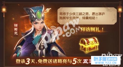 最强法师诸葛亮,三日登录免费得 作为蜀国第一智囊,诸葛亮的传奇故事流传了千百年。而在资料片开放后,玩家只要连续三日效仿刘备三顾茅庐的佳话,拜访诸葛亮,即可获得游戏最强法师诸葛亮,并附赠5次5连抽机会。玩家在参加求贤令活动完成指定任务后,更能免费获得强力金色和紫色武将哦!