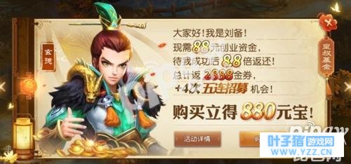 资助刘皇叔,投资88元返还880% 刘备能够从一介贫民成为三国一大势力,离不开诸多伯乐对其的资助。而现在,玩家也可以参与资助刘皇叔,待刘皇叔飞黄腾达之日,必能收获丰厚回报。玩家只需花费88元购买皇叔基金,即可畅享高达880%的等价元宝返还。从30级开始,刘皇叔将会返还高额数量的金券和4次五连抽机会,等级越高返还越多!总价值6888等价元宝,让玩家可以有足够的资金一展抱负!