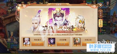 3月2日,象征着甜蜜团圆的元宵节即将到来。为了庆祝这春节之后的第一个重要节日,无数人都会走到街头,赏花灯、猜灯谜,然后在家中和家人分享一碗元宵,表达对于未来的祝福。在这个特别的日子里,《三国如龙传》也于3月1日~3月4日,为玩家开启了三大精彩节日活动,让玩家能够获得满满福利! 元宵神将:天降幸运为你打call 神将是玩家在《三国如龙传》中重要伙伴,有神将的帮助,玩家能更轻松地获得战斗胜利。为了能够让更多玩家与神将有一次亲密接触的机会,《三国如龙传》将在活动期间的每天20:45开启打call活动。玩家只要为自己所喜爱的神将打call,就有机会在21:00抽到自己心仪的神将,与“TA”一同驰骋三国世界!