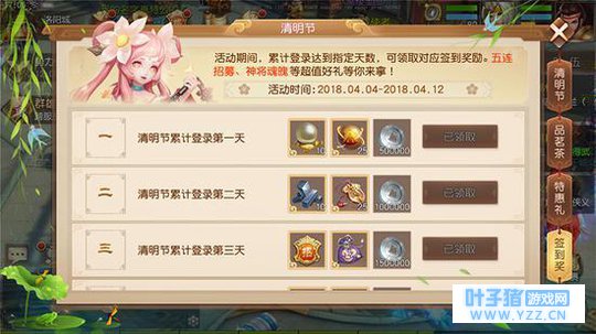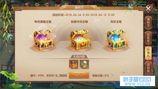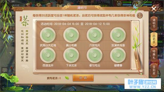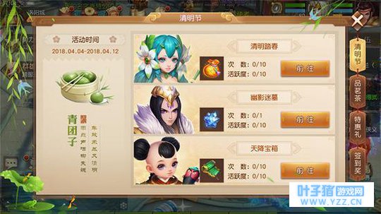 天降宝箱:在活动期间,每小时将会随机在洛阳、司隶、并州刷出天将宝箱。其中银宝箱可由单人或组队开启,金宝箱则必须组队开启。 品茗茶:春意正浓,一杯好茶助你开启一天好心情。在清明期间,玩家每获得20活跃度,就可以开启一次茗茶寻宝,从多种茶水中兑换自己心仪的奖励。在获得奖励之后,玩家还会随机获得茶神的祝福哦!