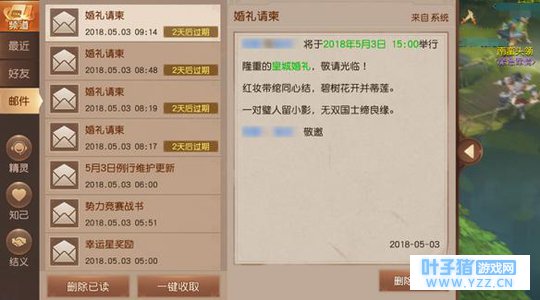 花车巡游,创造属于两人的浪漫回忆 在玩家预约婚礼之后,玩家可以在雅致和盛大两种婚礼风格中选择自己喜爱的风格。而预约盛大婚礼的玩家,将被附赠一次花车巡游机会。在婚礼当日,新人将坐上花车,接受众人的祝福。同时,花车附近还会刷出喜糖礼盒,跟随于花车左右的路人可以捡拾喜糖礼盒,分享一份喜气! 宾客同喜,祝福新人永结同心 在婚礼举办过程中,前来贺喜的宾客也可以在司仪助手处,购买撒花、礼花、贺喜宝箱,为婚礼增添一份喜气,并以自己的方式为新郎新娘送上诚挚的祝福!