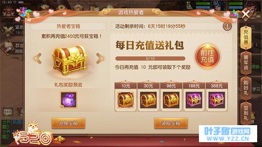 每日充值:双重千元豪礼表白你心 千万热爱,回馈老玩家!在活动期间,玩家每日充值只要达到10、30、98、198、368元即可获得对应返利礼包,返利折扣高达30%!同时,前三次充值满368元的玩家,还能额外获得“5”、“2”“0”三种奖章,集齐三大奖章更能兑换一份价值千元的游戏礼包。双重回馈,双重感恩,现在就为你开启!