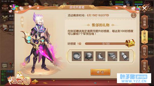 克敌机先:兵马未动粮草先行 兵家之道,就在于能料敌机先,提前做好战斗准备。在活动界面,玩家可以向天将张郃资助染色道具、宝石、低级兽诀、军资等一系列的道具,提升张郃与自己的好感度。也许有朝一日,张郃将降临于三国世界中,为自己的伯乐鞍前马后呢?