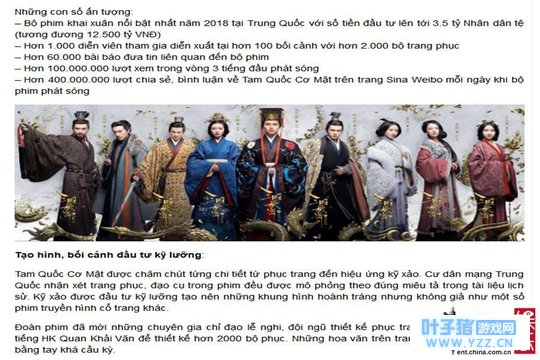 考究服化道还原史实 优良幕后团队深耕精品古装剧 众所周知,近年来随着国产剧的出口数量的增加,古装剧已经成为国产剧“出海”的主力军,精美的画面、细致考究的古装服饰、大气恢弘的宫廷布景都在淋漓尽致的展现中国传统文化,吸引海外观众的目光,而《三国机密之潜龙在渊》也正因如此获得了关注。 《三国机密之潜龙在渊》电影级的画面构图和严谨考究的道具服饰一直都是追剧党和众网友热议的焦点,据悉,此次剧中设计了将近2000套服装,深入考究三国时期历史,参考古代出土文物,衣服上的织绣全部手工缝制。还有剧中的倭堕髻、汉代盔甲、天子的十二章冕服和12串白玉珠串,包括人物日常生活的各种礼节都高度还原了史实。而剧中各种道具更是被网友扒出许多博物馆同款,更有网友被杨修把玩的错金银镶嵌铜骰惊艳,表示“好想求淘宝同款!”此次《三国机密之潜龙在渊》启用强大的幕后团队为制作保驾护航,将匠心融于细节,为观众带来了一场极致的视听盛宴。