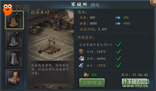 军械种类 军械所中共有四类军械:投石车、木牛流马、井栏和战鼓,它们有着不同的分工和作用。 投石车:攻击速度很慢,但伤害较高。对近战部队造成额外伤害。 木牛流马:它们本身没有攻击力,但是可以提高部队的负重,让外出采集资源的部队能够带回更多的资源。 井栏:攻击速度很快,但伤害较低。对远程部队造成额外伤害。 战鼓:自身没有攻击能力,但可以通过擂鼓助威来提高全军的攻击力。 军械的升星 军械可以通过升星来提升其属性,通过消耗一定的物资来增强军械的属性。