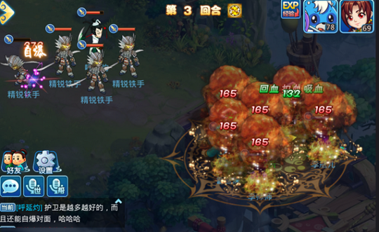 2.阵容搭配:前期单人通关难度过高,所以组上你的小伙伴一起过剧情吧(2医生2输出1封印)或者(2医生3输出) 3.携带宠物:由于精锐铁手有尸爆技能,所以建议带单法宠、物理宠物或者血宠(一定不要带群法宠) 4.打怪技巧:由于主怪每回合会召唤小怪,所有一开始就应该集火呼延灼,优先击杀呼延灼(击杀呼延灼的时候用单体伤害技能)。击杀完呼延灼后,如果队友血量不足的情况下,输出全部防御,等医生把血回上来再选择击杀下一个精锐铁手,精锐铁手自爆技能伤害是很高的,所以一定不要用群体伤害技能,一只一只的击杀精锐铁手,否则会灭团的! [编辑:叶子猪小秘书]