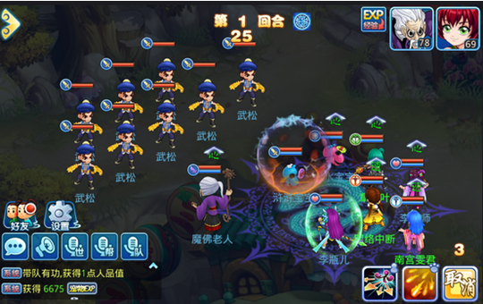 4.武松,浴火重生,让小怪无限复活,这个要重点强调一下,新手可能打到这里就纳闷了,前面都挂机趟过,这里无限复活这怎么玩?其实奥秘就是后排中间的那只萌萌哒武松(困难的则不固定,会步月流影技能的才是武松真身),需要先手动干掉他,然后整个团队就失去复活能力了,轻松搞定~