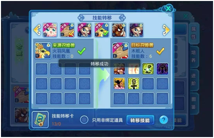 从上图可以理解,转移技能是将来源召唤兽(火羽凤凰)的技能转移到目标召唤兽(木桩人)身上。但对于两者都有所限制:来源召唤兽的技能数量必须大于等于6个,目标召唤兽的技能数量小于等于5个。