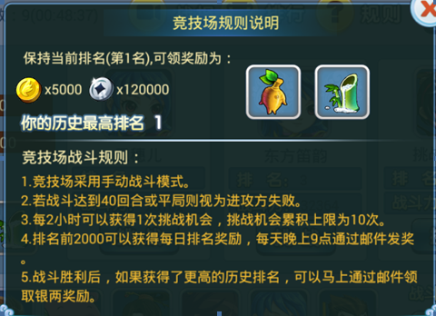 值得一说的是,对于竞技场排名前2000的玩家,每天晚上9点会根据排名的不同通过邮件发放不同的奖励,排名越高奖励越丰厚,所以,每天一定要使自己的排名尽量的靠前。