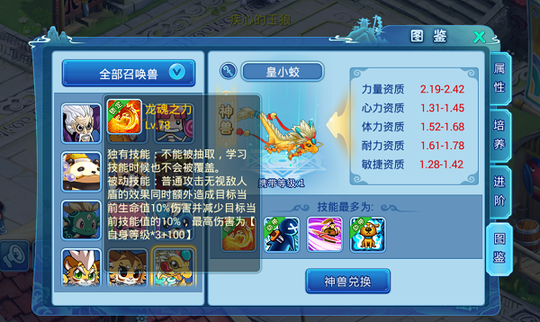 从属性图可以看到,皇小蛟能力值十分出众,力量资质更是逆天,最高能达到2.42,超越浒浒成为目前水Q力量资质最高的召唤兽。 另外独有技能“龙魂之力”:普通攻击无视敌人盾的效果同时额外造成目标当前生命值10%伤害并减少目标当前技能值的10%。在龙魂之力的加持下,皇小蛟不仅能够有效针对目前物攻宠吸血护盾技能,还能附加10%生命值和技能值的扣除,对肉盾和法宠都是十分有效。