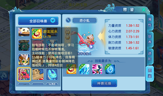 最高2.29的心力资质,虽然没有另一神兽水水高,但是独有技能“游龙戏水”却让赤小虬有超越水水成为第一法宠的资本,游龙戏水:主动,使用后偷取目标15%的精神力(目标降低,自身精神提高,提高量和目标精神降低量相同),持续4个回合。 在偷取对方精神后,法伤直接提升一个档次,一个群体法术后,敌人可能就半残了。另外,由于技能是偷取精神力,对术士也是有奇效,能够有效降低术士的输出。 值得一提的是,“龙魂之力”和“游龙戏水”两个独有技能不会在神兽学习技能,俗称“打书”时被覆盖,大大减少打书过程中,反复覆盖强力的技能的坑爹情况。 【等级开放古风装备颜值爆表】 本次更新另一重点则是等级的开放,最高等级将从目前的69级提升至79级,同时这也意味着70级装备的到来。从目前曝光的装备图可以看到,《水浒Q传》手游一如既往保持古典风格,莲花造型的铃铛、充满野性魅力的短弓、自然和谐的葫芦,把古风诠释得淋漓尽致,颜值爆表。