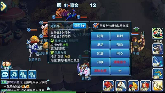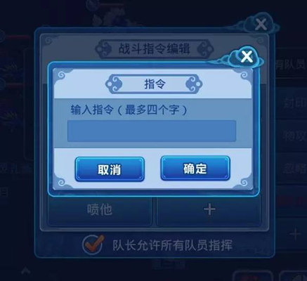 在长按敌人或队友身上,会出现指挥系统,目前系统预设了14个指令: 敌方:集火、封印、守尸、物攻、法攻、忽略、喷他; 我方:防御、解封、复活、加血、加蓝、同心、复活; 另外,我们可以选择是否允许其他队员参与指挥,如果不允许,就只有队长才能发出指令,这个选项的使用与否,取决于队伍的指挥的习惯。