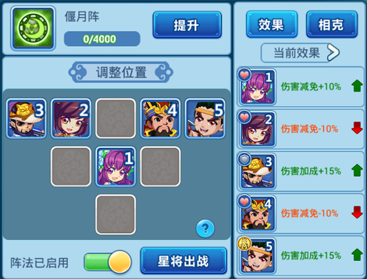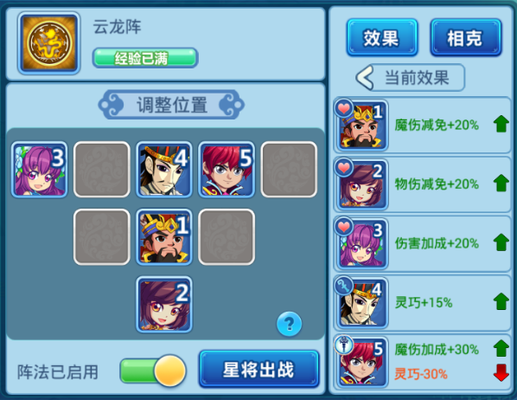 术士:多数使用云龙阵让法术伤害爆表,其次是雁行阵灵巧加成先声夺人。