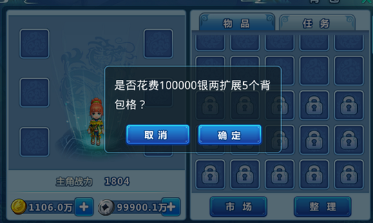 1.背包 玩家在游戏中所获得的物品都将存放在背包中,玩家可随时进入背包进行查看和整理 扩充背包:如果背包格子不够用可以点击以下图标给扩充背包哦,当然扩充背包格是要消耗一定的银两的哦,最多能扩充12次背包。