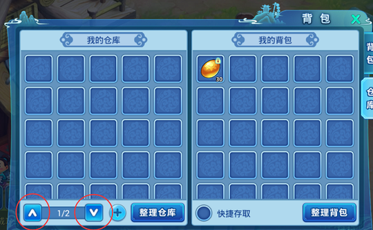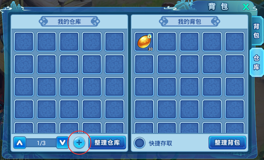 点击上下箭头可以切换仓库 扩张仓库:如果觉得仓库也不够存放物品的话,仓库也是可以扩充的,当然也需要消耗一定的银两的。最多能扩充3次仓库
