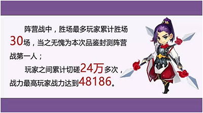 阵营战中,胜场最多玩家累计胜场达到30场,当之无愧为本次品鉴封测阵营战第一人;玩家之间累计切磋24万多次,战力最高玩家战力达到48186。 水水在此代表开发组衷心感谢水粉们,对于本次品鉴封测的热情支持,我们也会做好每一项的改进,另外,水粉们可以在留言中说说你们喜欢的趣味数据,我们在下次的趣味数据报告中再次一同回味。 [编辑:叶子猪小秘书]