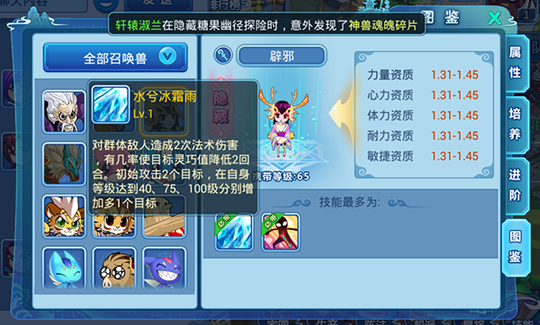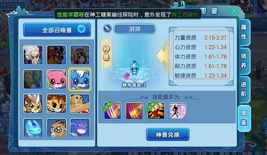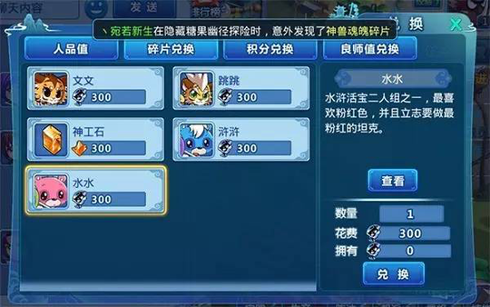 神兽兑换 不管如何驯养、精炼或者学习技能,拥有一只本身资质优秀的神兽才是最重要的。那如何获取神兽呢?在水Q中,总共有4只神兽,包括水水在内,都非常高冷,无法直接捕获或合成,只能通过神兽碎片兑换,而神兽碎片只能通过挑战隐藏糖果副本获得,幸好隐藏糖果副本难度不大,只要水粉们储备了足够的水仙花,刷够300个神兽碎片就能与水水和我的其他小伙伴见面了。