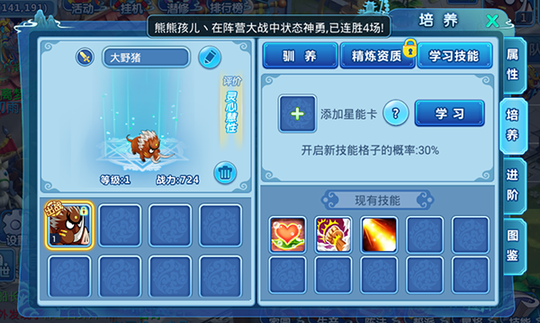 技能打造 没有技能的召唤兽始终是一只平凡的召唤兽,纵使有优秀的五围,没有强力的技能,强如水水也只能抄着波板糖去敲敲打打,输出也许还比不过有连击重击的大野猪。因此,在驯养出优秀资质之后,我们应该去着手让召唤兽学习强力的技能。 召唤兽每学习一个新的技能,需要消耗一张包含召唤兽技能星能卡,而星能卡目前可以通过挖藏宝图/高级宝藏图、商城购买来随机获取,或者炼化召唤兽:随机获取召唤兽身上的其中一个技能。从下图看到,通过学习,水水的大野猪学习了重击技能。在每次学习新技能的过程中,召唤兽都有机会开启新的技能格子,也就多学习一个技能。刚刚我的大野猪,本来只有两个技能,通过学习,现在变成有3个技能。但随着召唤兽所学习的技能增加,开启技能格子的难度就越大,所以要打造一只拥有极品技能的召唤需要水粉们多多努力哦。目前,一只召唤兽理论上最多可以学习15个技能。