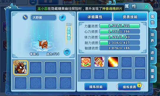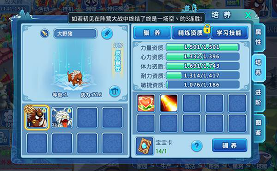 从上图看到,通过消耗宝宝卡,成功将大野猪驯养,水水的大野猪资质明显发生了改变,力量资质达到了最高1.501,体力资质也达到了1.691,但敏捷资质降低到了1.076。所以每位水粉要注意,驯养召唤兽是有风险的哦,如果没有驯养出需要的资质提升,可能会得不偿失。另外驯养还会使召唤兽等级重置为1,技能重新随机生成,所以水粉们应该在驯养过后才开始练召唤兽。如果需要驯养神兽的话,水粉可要准备大量的高级宝宝卡哦。