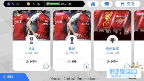 (《实况足球》联赛进入页面) 玩家可以通过“签约”、“特级经纪人”抽取等方式,获取心仪的球星、建立自己的球队。还可以在“联赛”当中,通过比赛经验的不断累积,完成球员在等级、等级上限、能力上的突破。