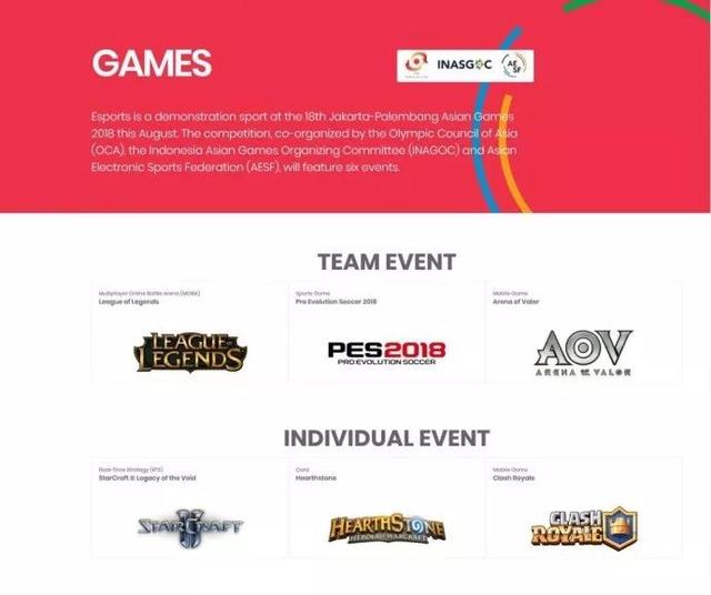 至于从官宣电竞加入亚运会表演项目,到预选赛即将开打,为何期间节奏不断,到底发生了多少冲突和矛盾? 莫急,我先来给大家梳理一下这次“电竞入亚”争议比较多的点,也算为本就不太了解的小伙伴们讲下来龙去脉。 比什么? 5月14日,亚洲奥林匹克理事会公布2018年雅加达亚运会的表演项目将会加入电子竞技比赛,《英雄联盟》、《Arena of Valor》、《皇室战争》、《星际争霸2》、《炉石传说》以及《实况足球》等六款游戏入选。