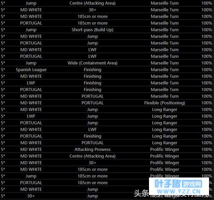 球员合成攻略记得在内测阶段已经有玩家在国际服合成C罗了,当时的公式为LWF+跳跃+葡萄牙(全5星球探)。但近几天翻查了下国外合成公式,发现合成顶级球星的公式多到令人发指的地步。所以以此类推 只要三个5星球探 (一个定律全5星必然是黑卡球员)与你想要的球员有关基本就能合出来。如下图Portugal=葡萄牙、Marseille Turn=马赛回旋,那么葡萄牙+马赛回旋+185就是C罗。大致看了下C罗的公式,100多种吧!所以合成球星不难,难在获得5星球探。再举例梅西公式:巴塞罗那+RWF+灵活、巴塞罗那+左脚+马赛回旋(5星5星)。