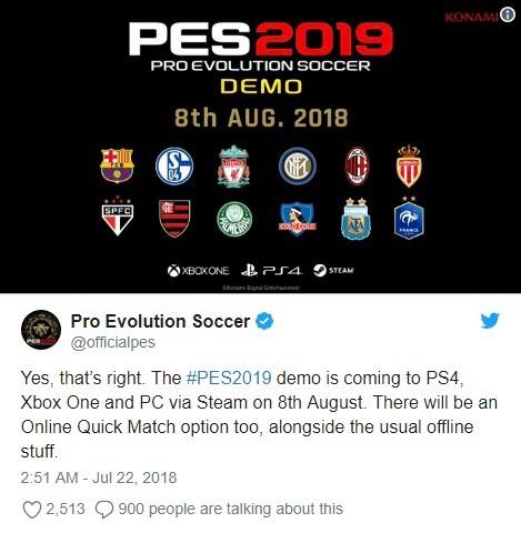 根据konami旗下《实况足球2019》(Pro Evolution Soccer 2019)官方推特信息,该作将于2018年8月8日在PS4,XBOX ONE和PC平台开启试玩demo,各位玩家可以提前体验《实况足球2019》的离线部分内容,以及在线快速对战比赛内容。