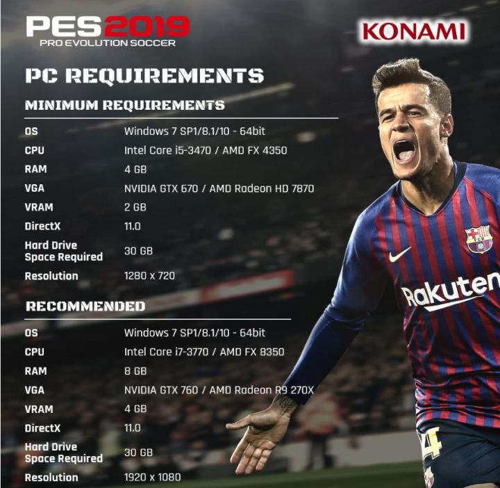 安装《实况足球2019》你需要30GB的硬盘空间,另外,游戏只支持DX11 API。
