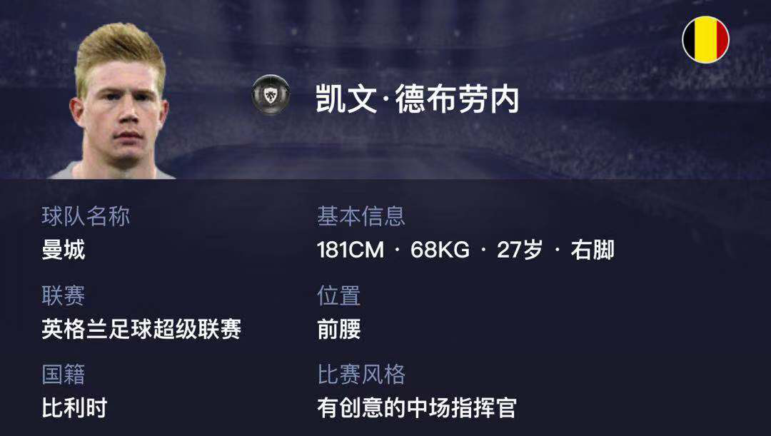 在《实况足球》里面,小编已经很多次的说到过前腰这个位置的尴尬之处。首先前腰作为进攻中场来说是很好用的。相当于中场能更多的参与到进攻中。但是《实况足球》目前讲究的是一个中场防守强硬,所以前腰这个位置相当于被小小的弱化了。但是《实况足球》里面还是有很多适合现在版本的前腰球员,比如今天小编要介绍的这位,可以说是目前《实况足球》版本里面的最强前腰—凯文德布劳内。