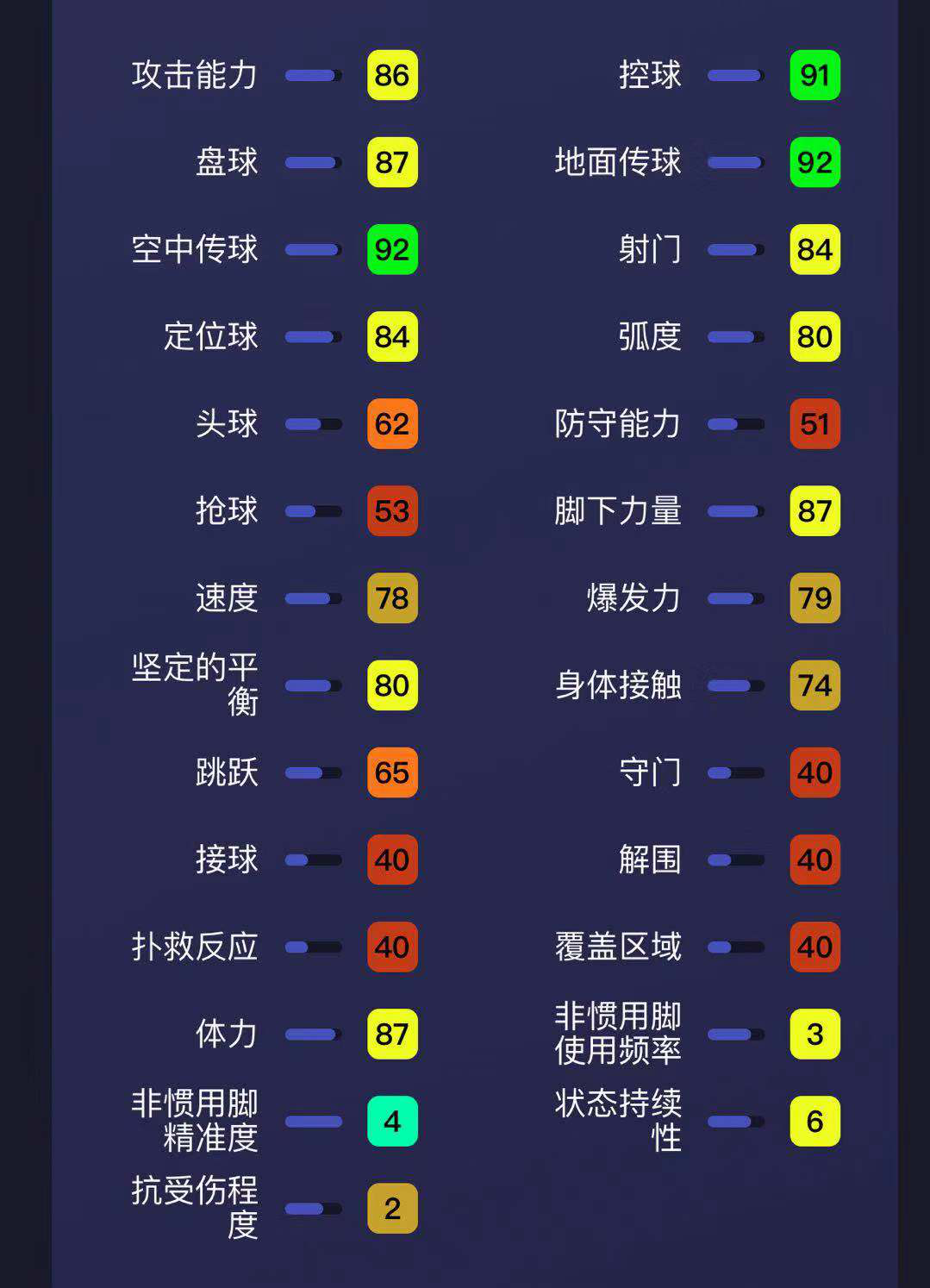 具体数值方面,德布劳内在《实况足球》里面控球和盘球都有90左右的评分。并且作为进攻性很强的前腰来说,德布劳内地面传球和空中传球都有92。攻击能力也有86的评分。最主要的是德布劳内脚下力量相当犀利。而且非惯用脚的使用频率也是很高。