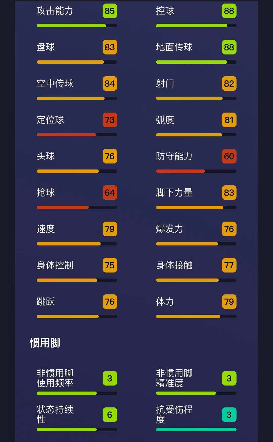 具体数值方面,哈姆西克在《实况足球》里面控球有88的评分。还有就是哈姆西克的地面传球也有88的评分。而攻击能力方面也有85的评分,另外哈姆西克的射门和空中传球都十分不错。尤其是射门和弧度都有81的评分,所以哈姆西克的远射相当不错。但是哈姆西克的体力仅仅有79的评分。