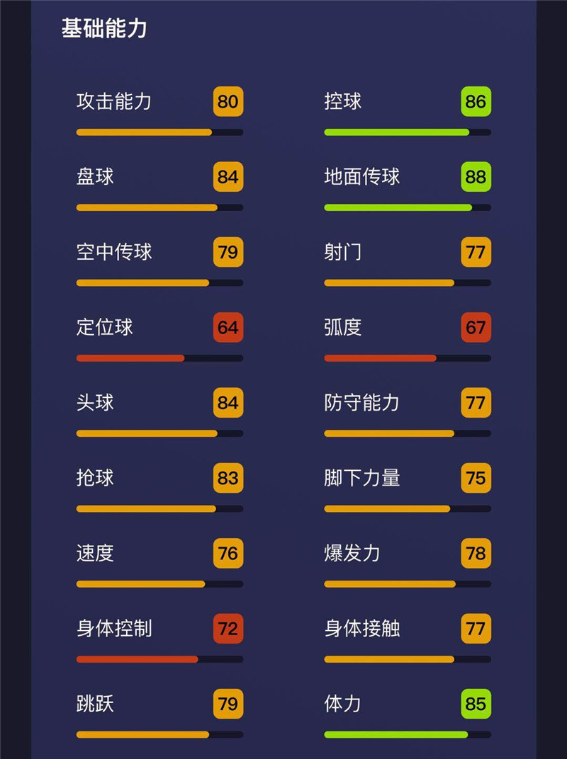 具体数值方面,萨乌尔在《实况足球》里面的各项数值都很平均。控球和盘球分别是86和84,在中场这个位置上并不突出。而地面传球和空中传球分别是88和79的评分。射门也有77的评分。而速度爆发力方面也有接近80的评分。最主要的是萨乌尔的防守能力和抢球都是相对来说不错的。防守能力有77,抢球有83。 具体打法
