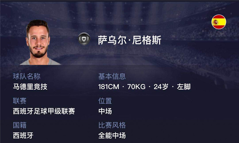 《实况足球》里面对于中场球员来说,传球和进攻能力是必不可少的,但实际上更重要的是防守。中场一旦被打穿了,那可就是真的完蛋了。小编给大家介绍过中场的几大“实战利器”,他们分别是:“比坎博纳”。但实际上这四人很难在现在的球员箱子里抽到,那么今天小编就给大家介绍一位可以说是现在中场四大天王的替代者,他就是来自马德里竞技的西班牙国脚萨乌尔·尼格斯。