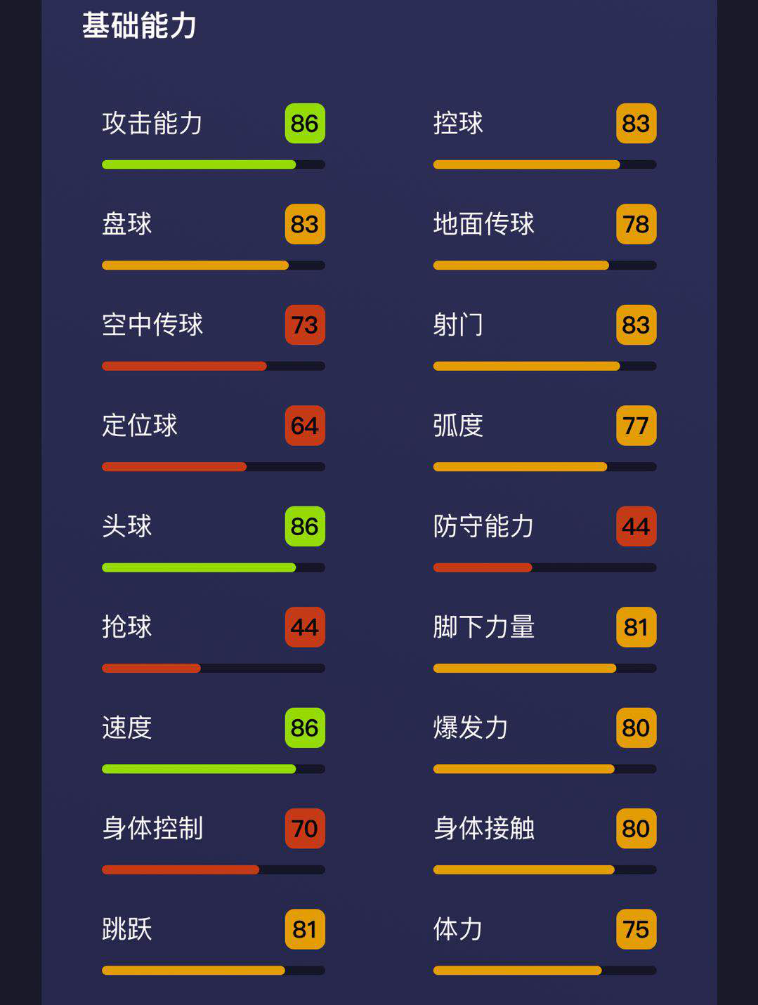 具体数值方面,《实况足球》里面的莫拉塔得数值在金卡里面也算得上顶尖了。攻击能力有86的评分,而控球和盘球也都有83的及格分。另外,莫拉塔的速度也很快,有86的评分,爆发力则是80。身材高大的莫拉塔头球也有86。