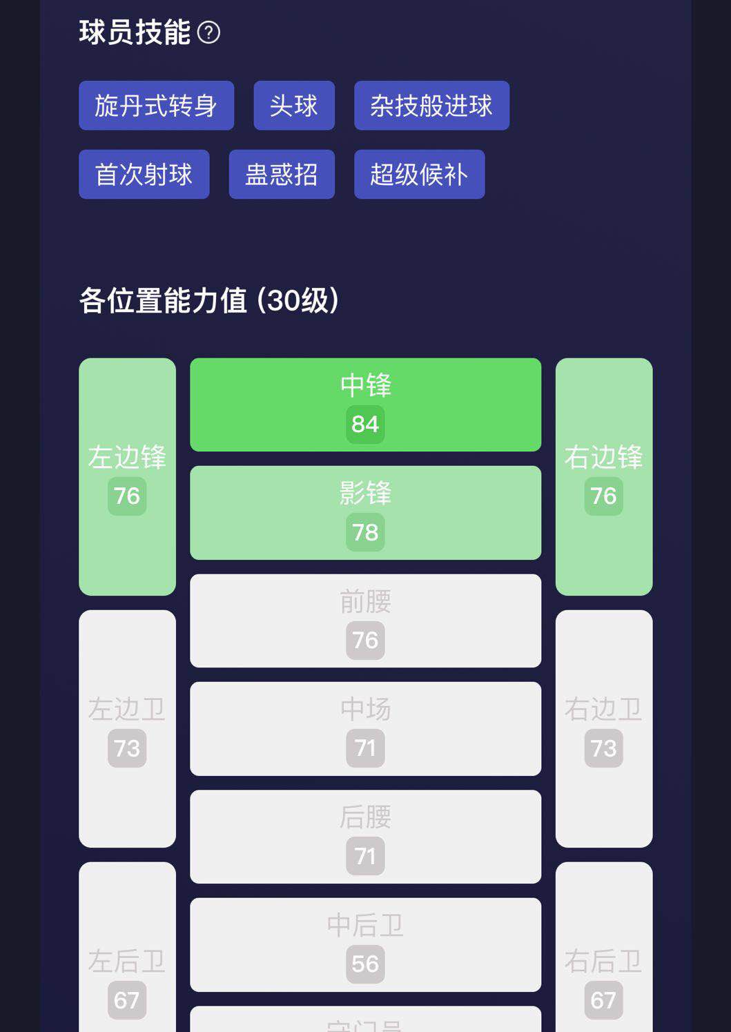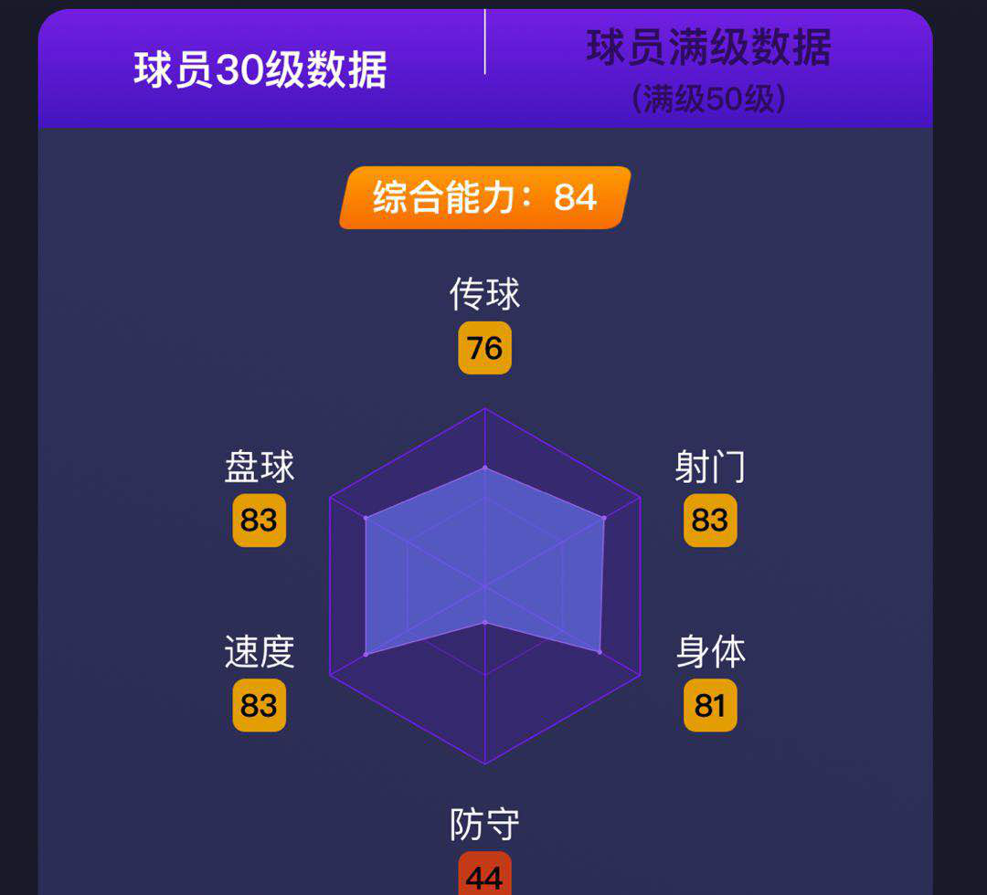 具体数值(30级评分:84)一般球员有从金卡升级到黑卡的,当然也有一些球员上了年纪,在《实况足球》里面从黑卡降级到金卡。但是,年仅26岁应该在上升期的莫拉塔竟然从黑卡变成金卡,这简直令很多玩家抓狂,尤其是一些已经高突了莫拉塔的玩家更是难受,但好在莫拉塔也就26岁,未来还不好说,俗话说得好,“人挪活,树挪死”。换队的莫拉塔说不定还能重回黑卡呢!