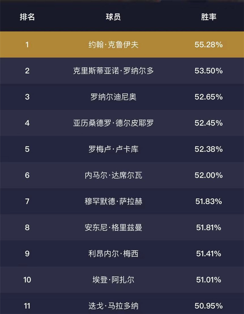 《实况足球》里面很多球员都有自己的胜率榜单,虽然有些时候球队的胜率是和阵容的搭配或者说是球员的状态有关系。但是胜率高的玩家喜欢用的球员自然有他胜率高的道理。今天小编就给大家介绍一位《实况足球》里面胜率超高的传奇球员,他就是来自荷兰的国脚约翰·克鲁伊夫,在《实况足球》手游目前的影锋胜率排行榜上面他也是位列第一名。