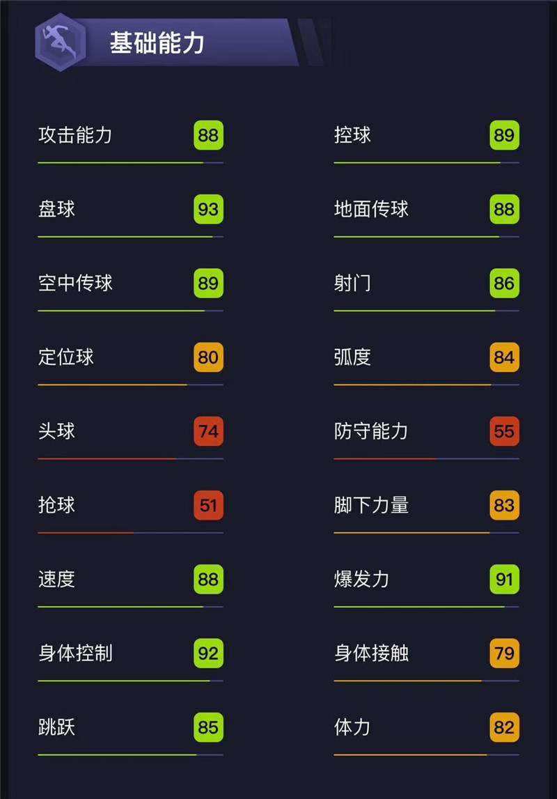 具体数据方面的话,克鲁伊夫的攻击能力和控球盘球都相当出色分别有88、89和93的基础数值,并且地面传球和空中传球分别是88和89,射门也有86的高数据。速度方面,克鲁伊夫的速度和爆发力分别是88和91,可以说是相当不错的数据了。而身体控制方面克鲁伊夫也有92的高评分。 具体打法