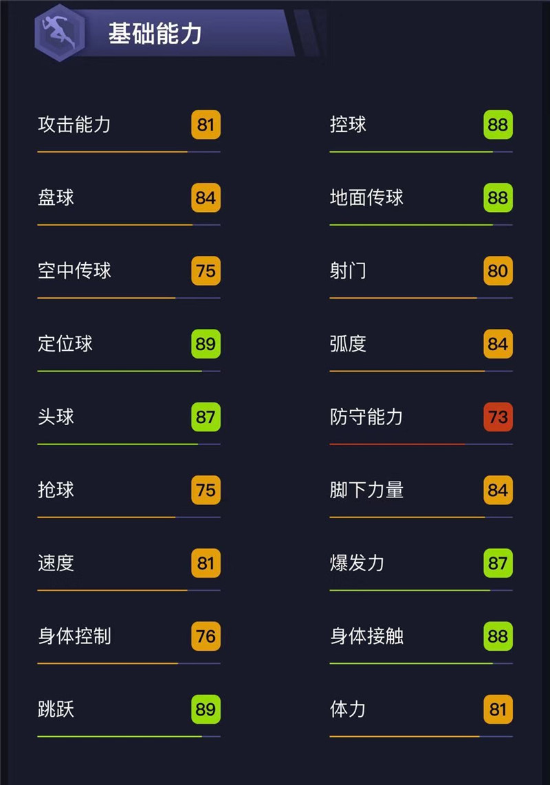 具体数值方面,古利特的控球和地面传球都有88的水平,可以说是相当高了。另外他的定位球有89的评分,头球和爆发力也有87的评分,总的来说都算是不错了。而古利特的爆发力和身体接触分别是87和88的水平,跳跃也有89,可以说是相当恐怖的存在。 具体打法